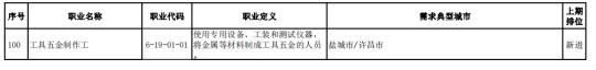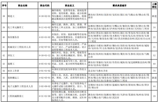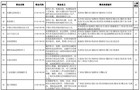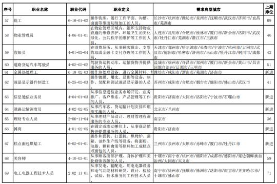 前十位职业分别为营销员、快递员、车工、商品营业员、市场营销专业人员、餐厅服务员、保安员、家政服务员、电子产品制版工、保洁员。