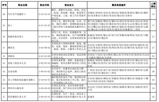 本期数据由“序号”“职业名称”“职业代码”“职业定义”“需求典型城市”“上期排位”六个部分组成。“职业名称”“职业代码”“职业定义”适用《中华人民共和国职业分类大典(2015版)》的职业分类标准。“需求典型城市”是指填报该职业需求的典型城市名单,排在前面的城市需求缺口大于排在后面的城市。“上期排位”表示上期(2022年第一季度)该职业的排位情况。