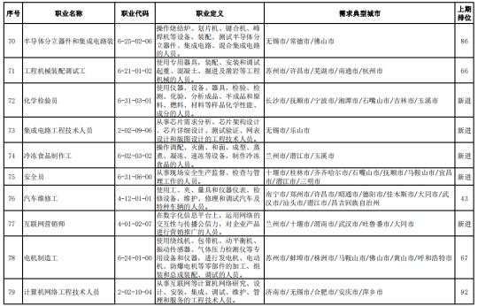 与2022年第一季度相比,招聘需求和求职人数持续回升,制造业缺工状况持续,电子信息产业缺工情况较为突出, “集成电路工程技术人员”“半导体芯片制造工”“电子仪器与电子测量工程技术人员”等职业新进排行,“半导体分立器件和集成电路装调工”“计算机网络工程技术人员”缺工程度加大,“电子产品制版工”进入排行“前十”,位列第9。